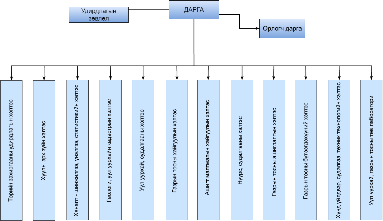 Төрийн захиргааны удирдлагын манлайлал, хүний нөөцийн удирдлагаар хангах, байгууллагын хөрөнгө санхүүгийн эх үүсвэрийг оновчтой удирдах, тайлагнах, газрын тостой холбоотой үйл ажиллагааны орлогыг тооцох, төсөвт төвлөрүүлэх, гэрээлэгчдийн төлөвлөгөө төсөв, өртөг нөхөгдөх зардлыг хянах, ашигт малтмалын хайгуулын ажлын зардлын доод хэмжээг баталгаажуулах;