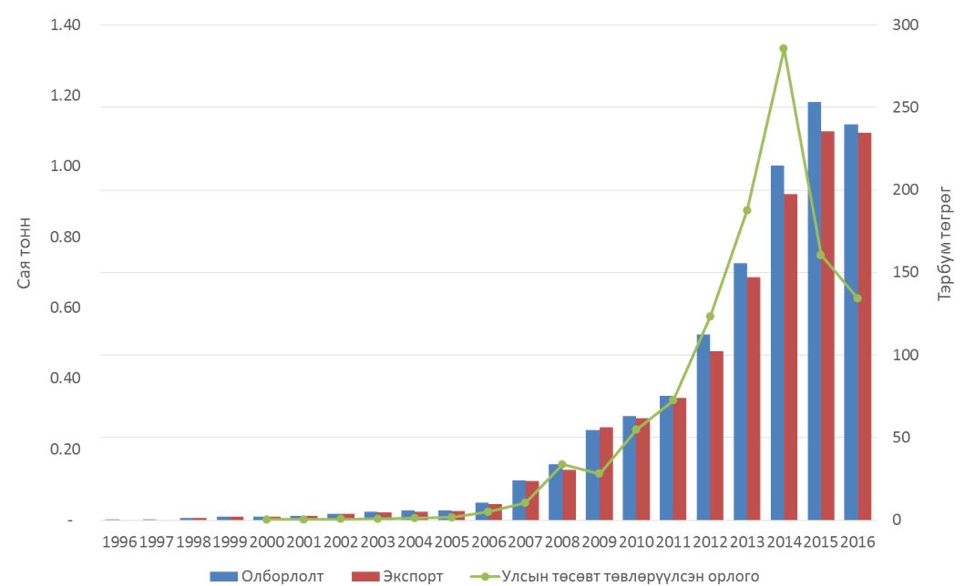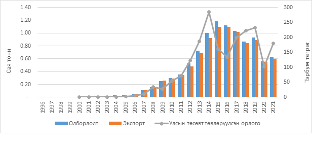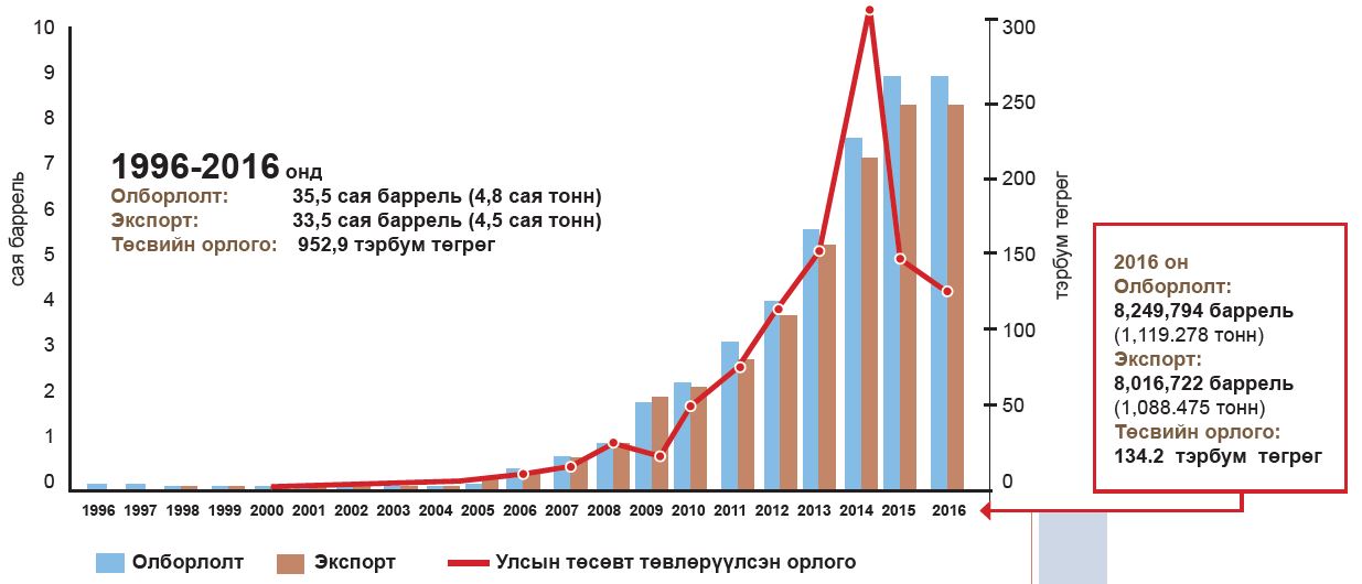 Монгол Улсын хэмжээнд 1998-2025 оны хооронд нийт 11.75 сая тонн газрын тос олборлосон ба 11.267 сая.тонн газрын тос БНХАУ-руу экспортлож, борлуулалтын орлогоос 2.79 их наяд төгрөгийг Улсын төсөвт төвлөрүүлээд байна. 2025 онд нийт 4.24 сая баррель буюу 579 мянган тонн газрын тос олборлон экспортлох төлөвлөгөөтэй ба 2025.06.11-ний өдрийн байдлаар 1.7 сая баррель буюу 231.3 мянган тонн газрын тос олборлож, экспортолсон. Төлөвлөгөөний гүйцэтгэл 40.12 хувьтай байна.