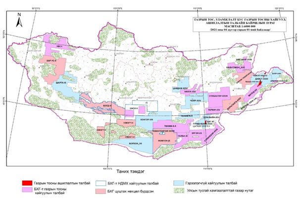 Монгол Улсын хэмжээнд газрын тосны хэтийн төлөв бүхий 34 талбай ялгаснаас 2025 оны байдлаар Засгийн газрын баталсан Бүтээгдэхүүн хуваах гэрээний дагуу 4 талбайд газрын тосны ашиглалтын үйл ажиллагаа явагдаж байна. Үүнд Тосон-Уул XIX, Тамсаг XXI талбайд Петрочайна Дачин Тамсаг ХХК, 1997 оны БХГ-т талбайд Доншен Газрын тос (Монгол) ХХК, Матад XX талбайд Петроматад ХХК нь тус тус газрын тосны олборлолт, ашиглалтын үйл ажиллагааг явуулж байна. /Зураг-1/